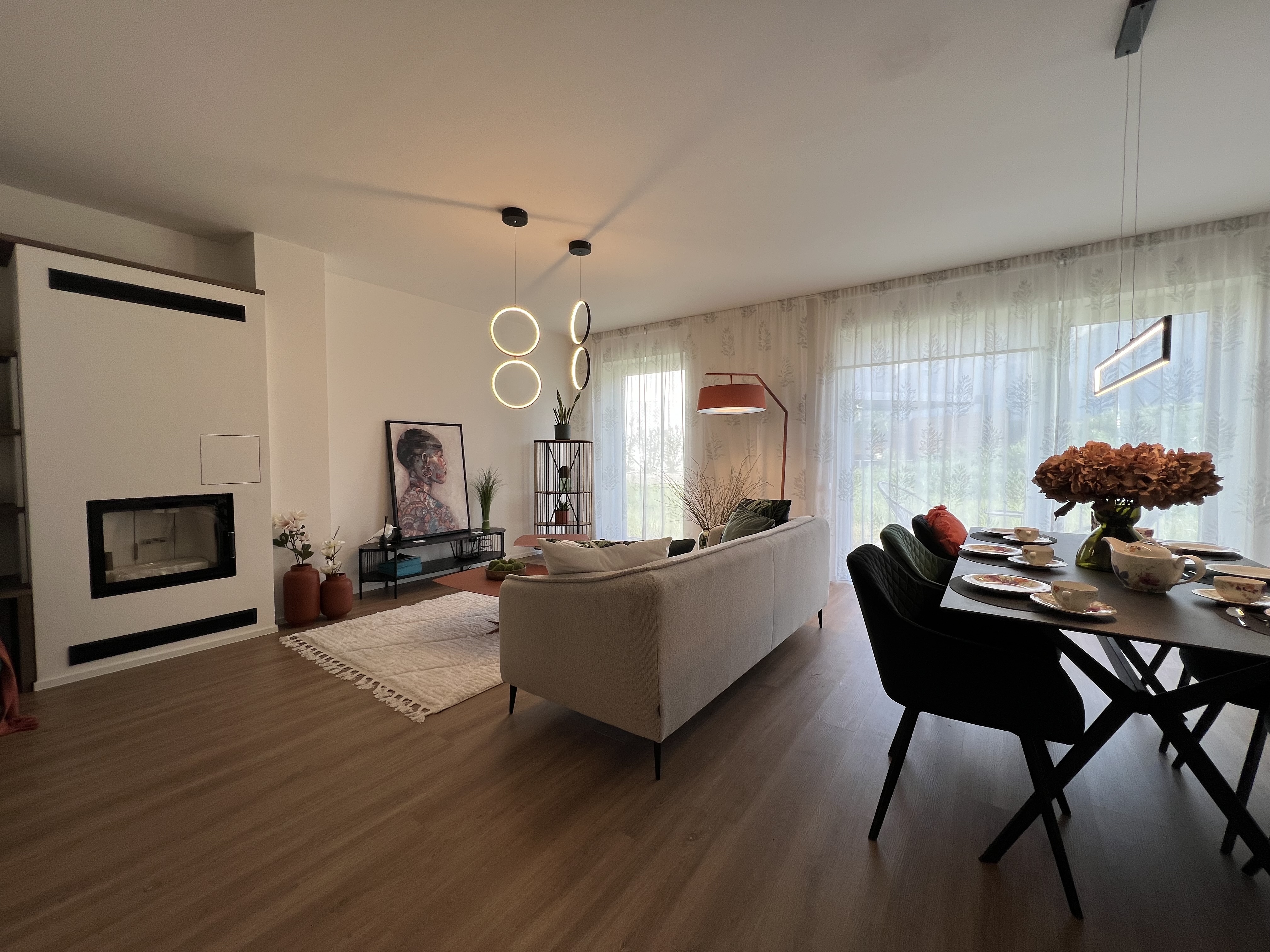 Řadové domy mají dispozici 5+KK. Přízemí je projektováno na prostorný obývací pokoj s otevřenou kuchyní, jídelnou a vstupem na terasu, na niž naváže zahrada. Dále se zde nachází velká vstupní hala, toaleta, technická místnost a schodišťová chodba, spolu se skladem pro uložení sezonních věcí, který je přístupný z venkovního parkovacího stání. Po chodbě se schodištěm se dostanete do 4 pokojů a 2 koupelen.